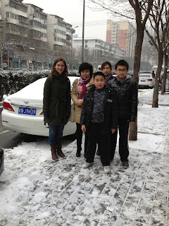 You may remember that I was planning an epic journey to visit Mimee's family last Sunday. Not actually hard- just one subway line switch and a lot of watching other people on the subway. It was a success! Of course it snowed, but that meant the air was actually quite good. Mimee's dad wasn't around, but here's a picture of me with them, feeling like a tree.
